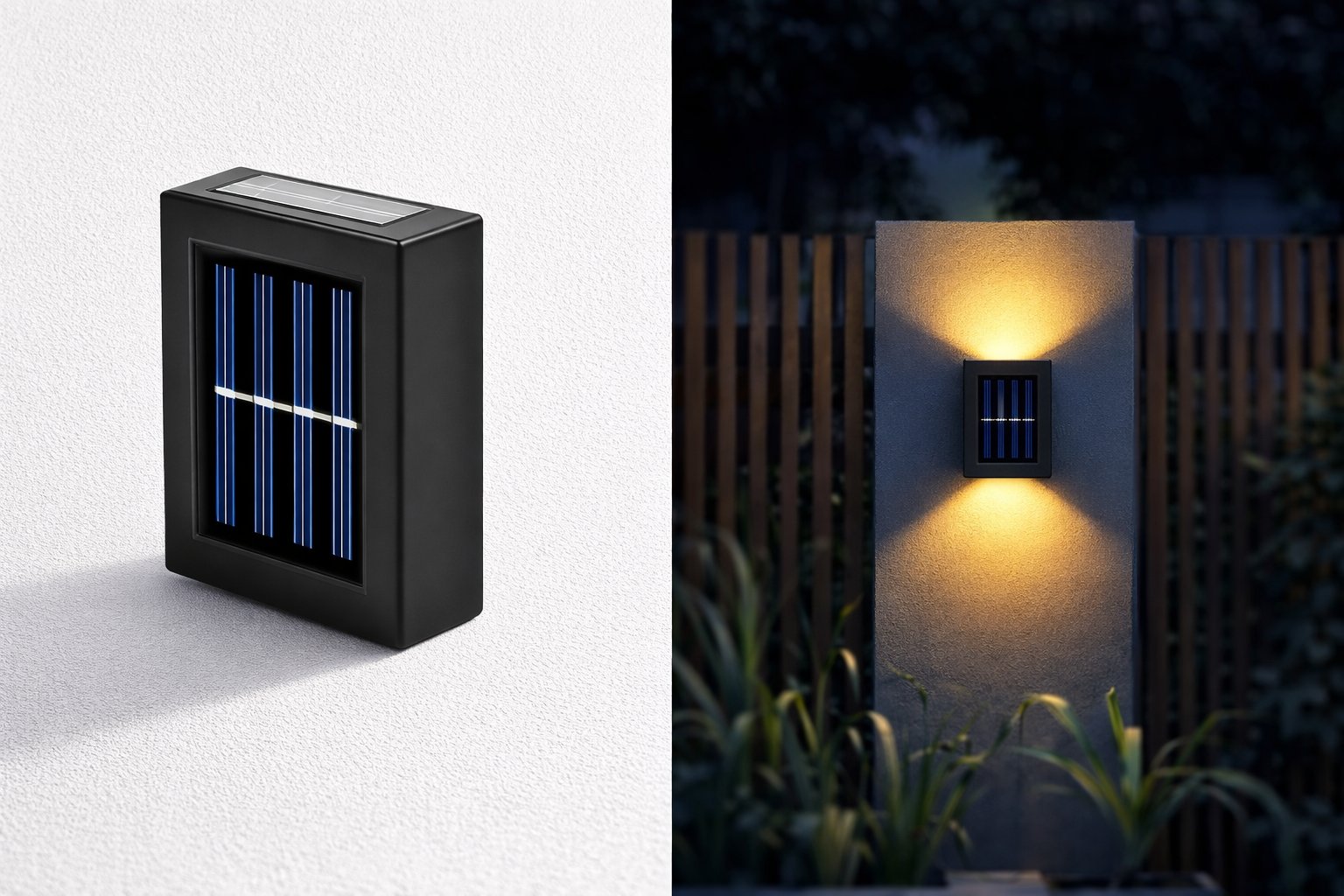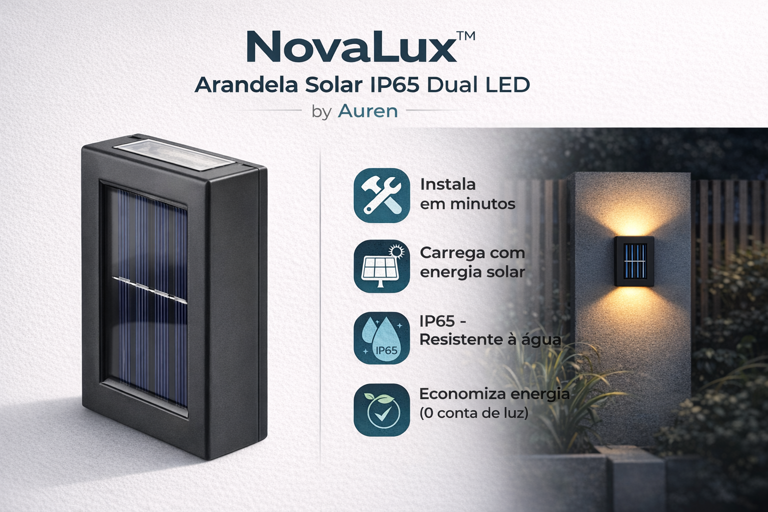 A NovaLux™ Arandela Solar IP65 Dual LED by Auren foi criada para quem quer iluminação externa automática, moderna e sem custo de energia elétrica.